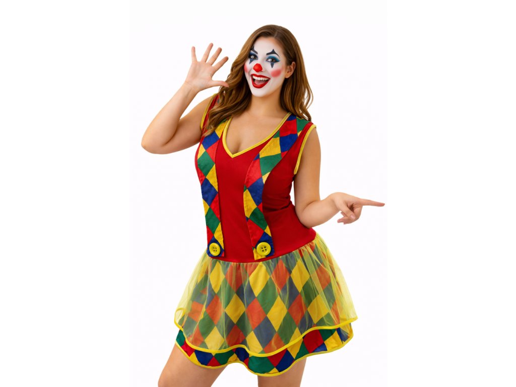 Doporučujeme doplnit o: červený klaunský nos, barevnou paruku (žlutou, duhovou nebo kudrnatou), síťované punčochy nebo barevné podkolenky, výrazné klaunské líčení.