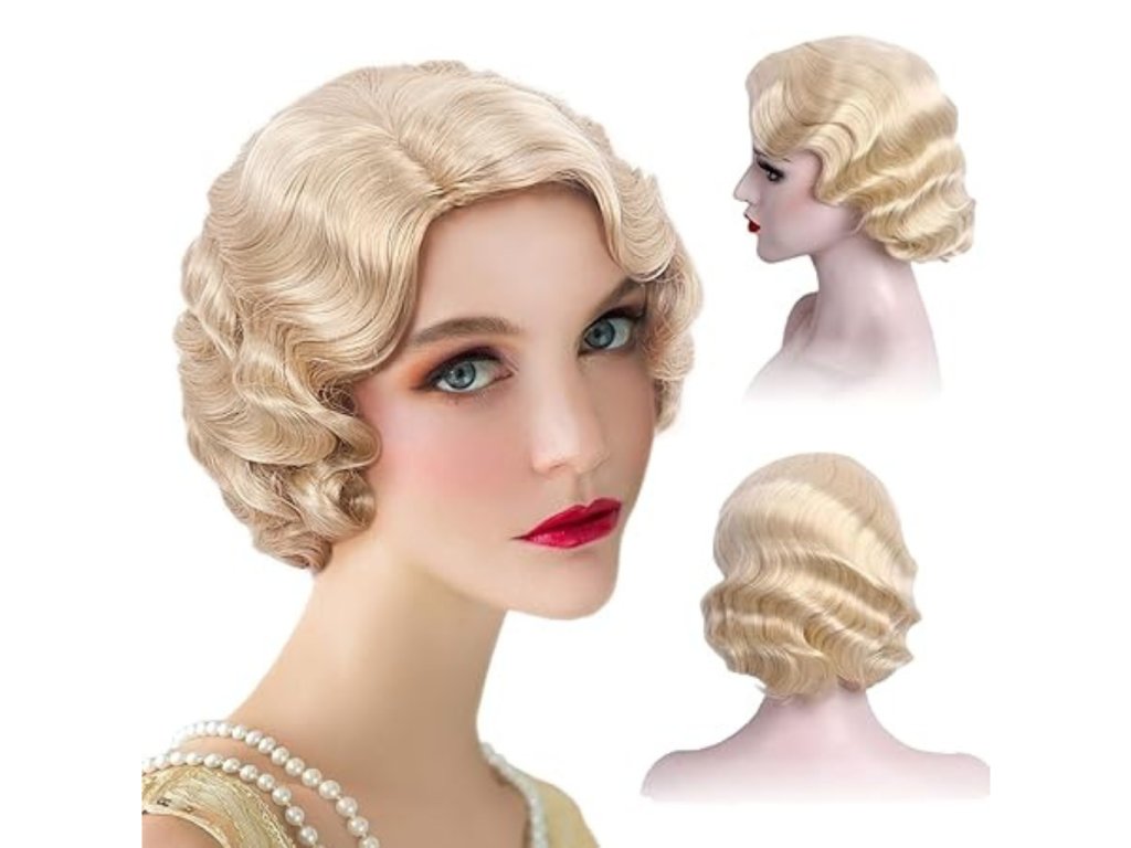 Stylová blond paruka ve stylu 20. let, inspirovaná ikonickými vlnami éry první republiky. Krátký střih s precizně tvarovanými vlnami vytváří elegantní, uhlazený vzhled typický pro Charleston a Great Gatsby styl.
