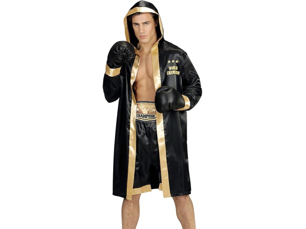 ostým zaujme na první pohled díky dlouhému boxerskému županu s kapucí v černo-zlatém provedení, který dodává outfitu profesionální a filmový vzhled. Součástí kostýmu jsou boxerské kraťasy s páskem „Champion“ a boxerské rukavice, které podtrhují autentický dojem skutečného ringového bojovníka. Lesklý saténový materiál působí efektně a zároveň je lehký a pohodlný na nošení.