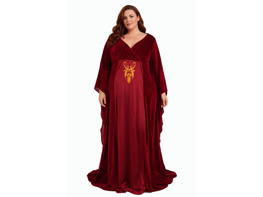 Šaty mají hlubší véčkový výstřih, splývavý střih a dlouhé volné rukávy, které dodávají celku tajemný a dramatický vzhled. Výrazným prvkem je zlatý motiv na přední části, jenž podtrhuje démonický a fantasy charakter kostýmu. Materiál působí luxusně, je měkký a pohodlný na nošení. Díky volnějšímu střihu jsou šaty vhodné i pro plnější postavy (je možno na zádech utáhnout nebo povolit) a krásně splývají s postavou. Kostým vytváří výrazný efekt i bez nutnosti dalších složitých doplňků.