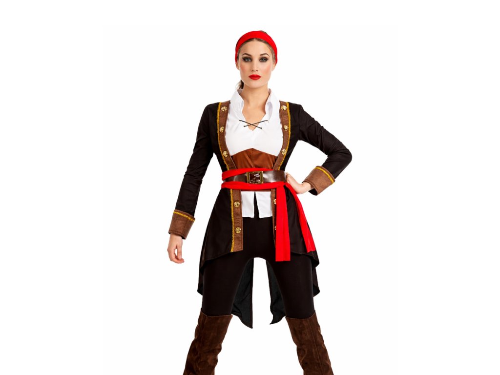 Kostým tvoří dlouhá tmavá kabátová tunika se zlatým lemováním a ozdobnými knoflíky, doplněná bílou halenkou s šněrováním ve výstřihu. Celý vzhled podtrhuje široký pásek s výraznou sponou a červená šerpa uvázaná v pase, která dodává kostýmu pravý pirátský šmrnc.