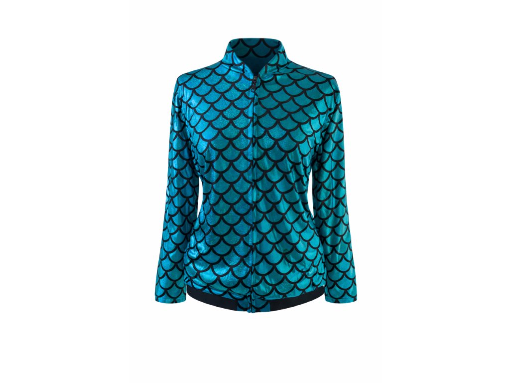 Originální disco bunda s výrazným motivem třpytivých šupin v tyrkysovo-modrém odstínu.