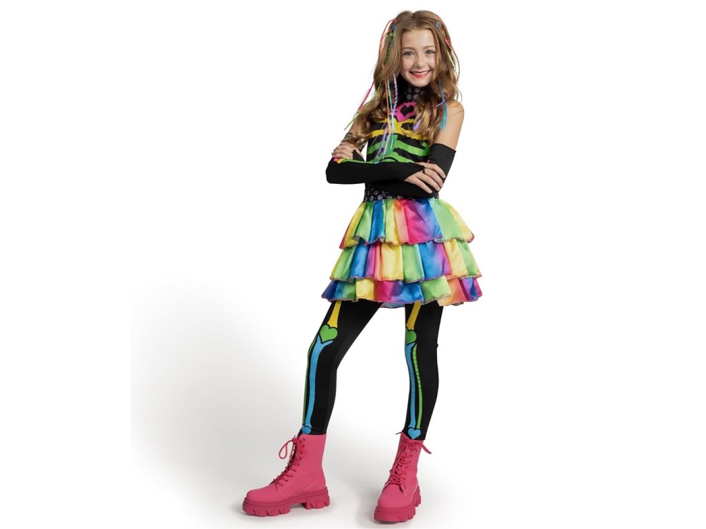 Veselý a originální dívčí kostým barevné kostry v deluxe provedení, který zaujme na první pohled.