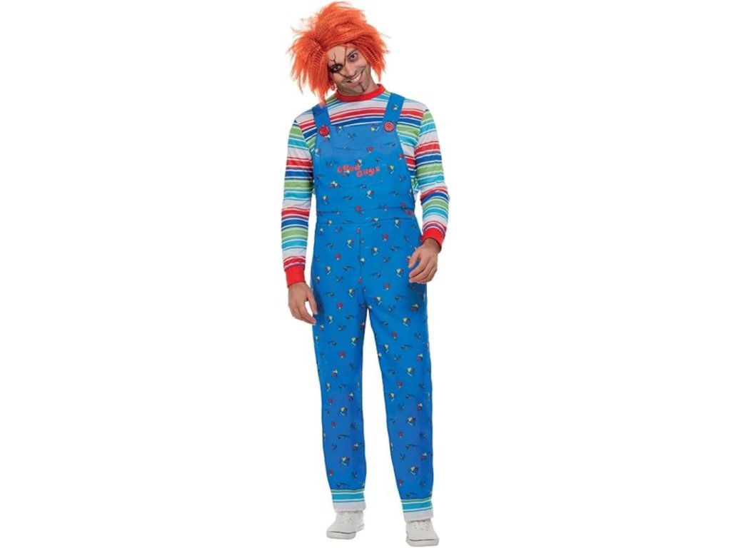 Tento Chucky kostým je inspirovaný ikonickou „dětskou“ panenkou z hororových filmů. Součástí je modrý overal s barevným potiskem a pruhované tričko s dlouhým rukávem, které věrně připomíná známý filmový vzhled.