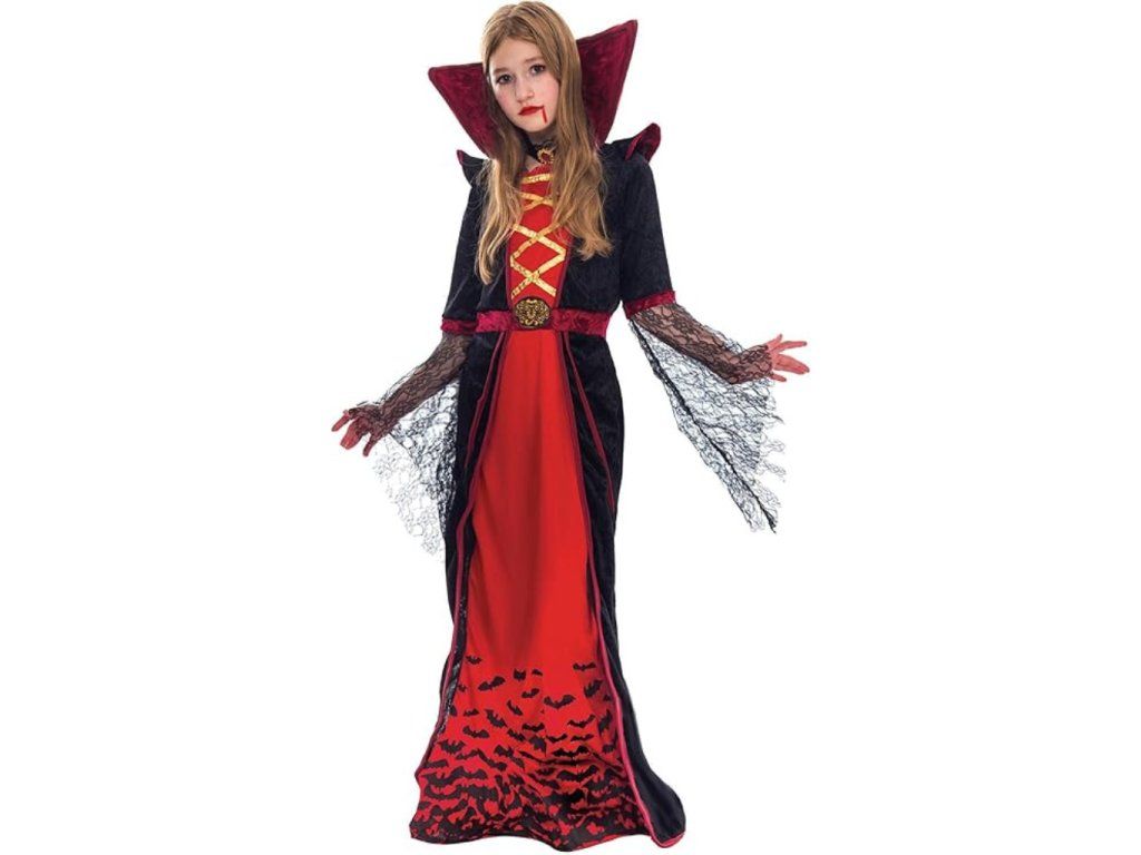 Stylový kostým upírky v královském stylu, který zaujme na první pohled svou kombinací černé a krvavě červené barvy.