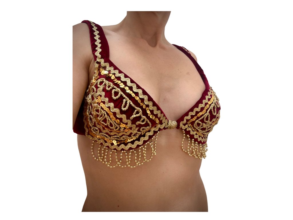 Elegantní a smyslný kousek, který podtrhne každý pohyb. Sytá vínová barva této ozdobné podprsenky působí luxusně a korálky při tanci jemně zvýrazňují rytmus pohybu.