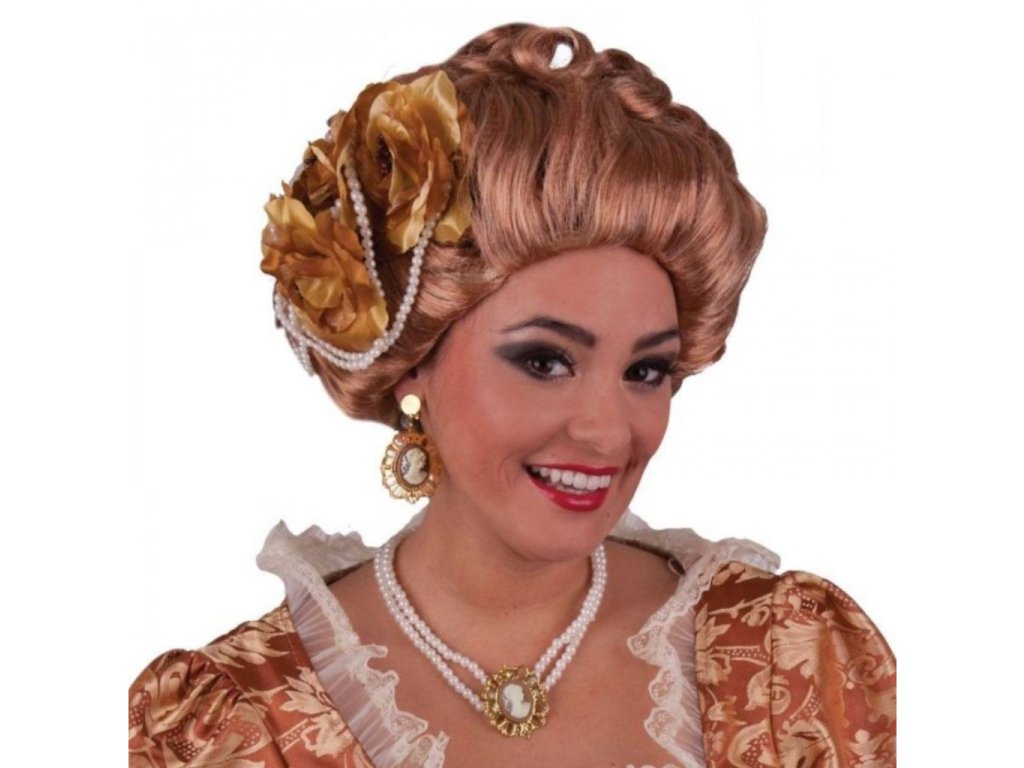 Bohatá paruka královny zdobená perlami a květy dodá Vašemu kostýmu nádech královské elegance.