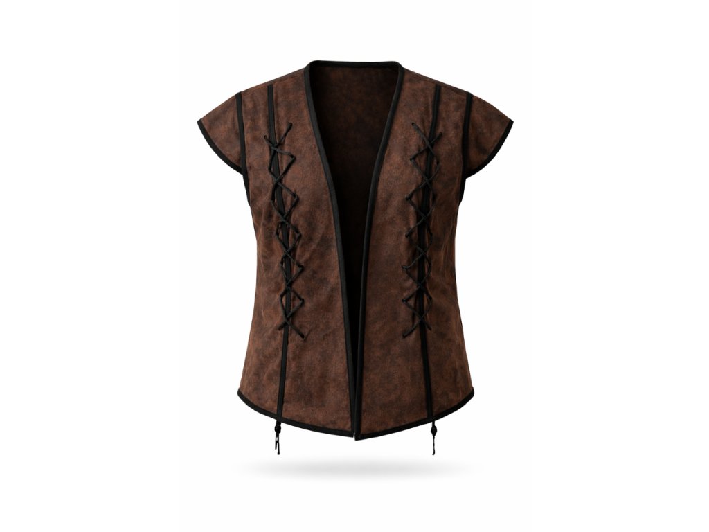 Vesta má otevřený střih bez zapínání, zdobená černým lemováním a výrazným šněrováním na přední části, které dodává autentický dobrodružný vzhled.