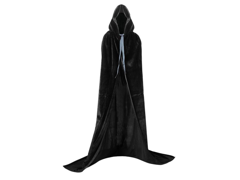 Tajemný, elegantní a nepřehlédnutelný! Dlouhý černý sametový plášť s kapucí je ideálním základem pro desítky kostýmů – stačí obléct a proměníte se v temnou postavu z jiného světa.
