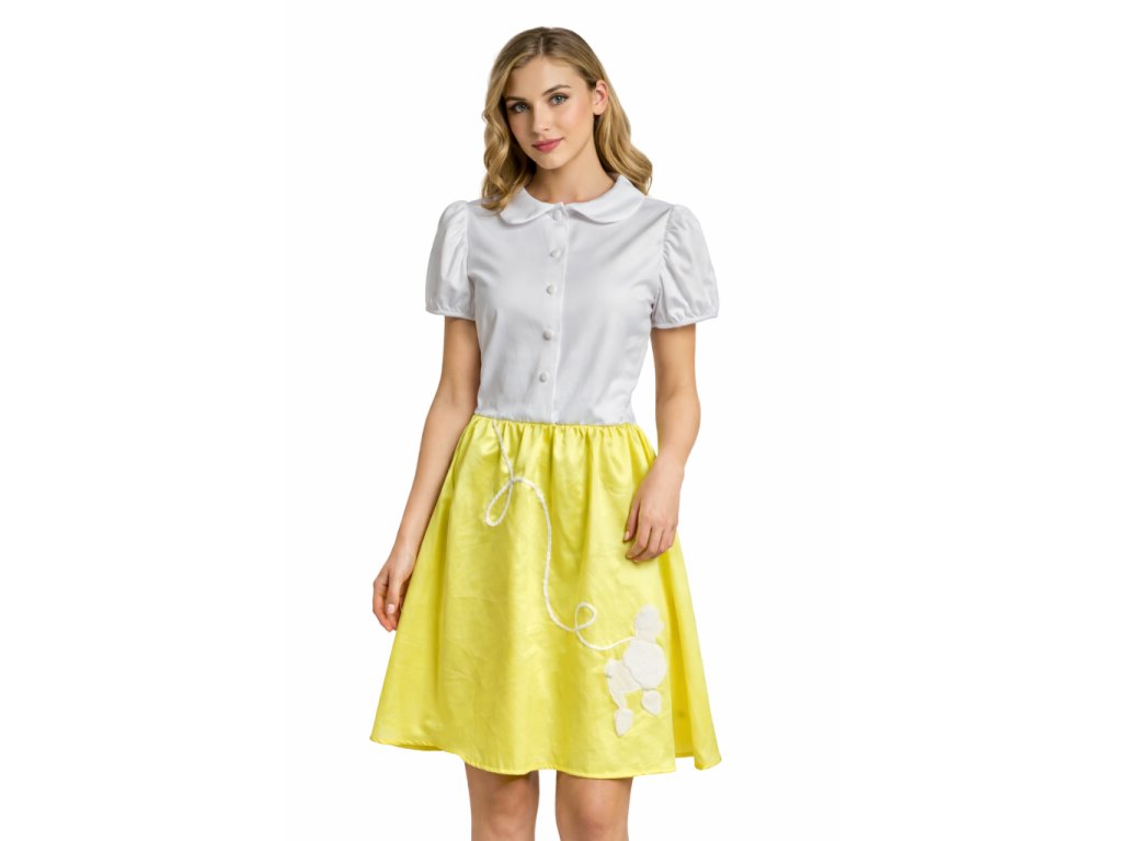 Kostým tvoří bílá halenka s krátkými nabíranými rukávy, kulatým límečkem a knoflíky v kombinaci se žlutou sukní áčkového střihu, která je ozdobena motivem pudla a dekorativní šňůrkou. Celek působí hravě, žensky a typicky retro.