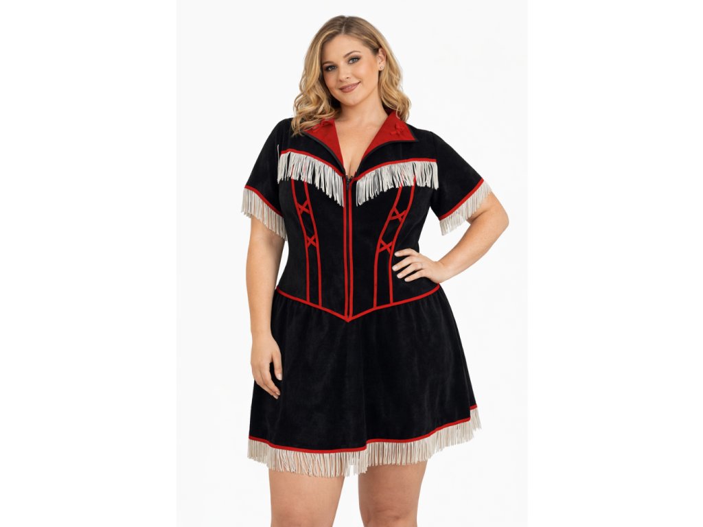 Šaty jsou v černém provedení s výraznými červenými detaily a bohatě zdobené třásněmi, které dodávají kostýmu autentický pohyb a výrazný vzhled. Horní část je tvarovaná do korzetového stylu s ozdobným šněrováním, který pěkně zvýrazňuje siluetu. Krátké rukávy a kontrastní lemování podtrhují westernový charakter šatů. Sukně je lehce rozšířená a zakončená třásněmi, díky čemuž působí šaty hravě a žensky.